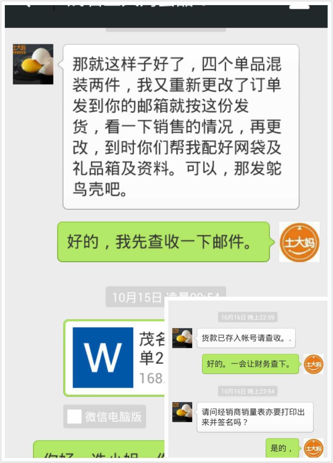 冼小姐结束广州之行后,第二天就确定要当我们土大妈茂名市的经销商,并想尽快能签定合同,进一批蛋品来卖,希望能让鸡蛋批发商土大妈好的蛋品得到当地人的认同,打开当地市场,能与其进口水果生意齐头并进。
